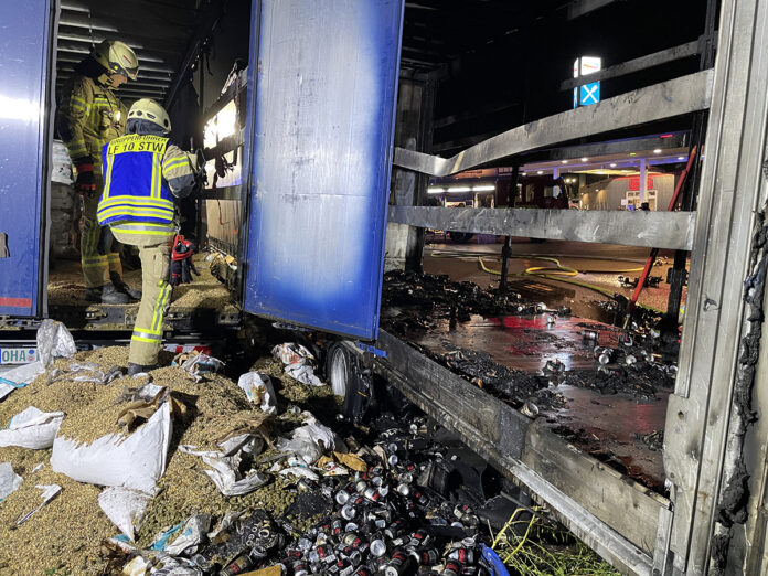 De hoofdzakelijk met drankblikjes beladen oplegger moest tijdens de bluswerkzaamheden volledig worden uitgeladen. Ook bij de aangrenzende vrachtwagen, geladen met diervoeding, moest een deel van de lading worden verwijderd om smeulende brandhaarden te bereiken.