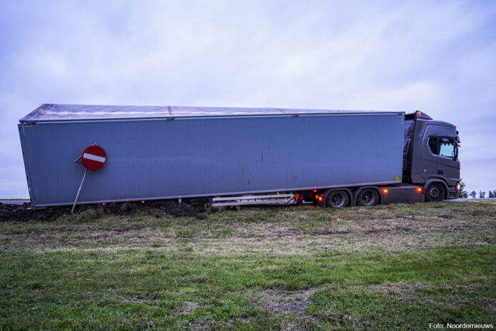 De oplegger kwam tijdens het opdraaien van de N34 in de richting van Emmen met de zijkant in de zachte berm en kwam scheef achter de vrachtwagen te hangen.