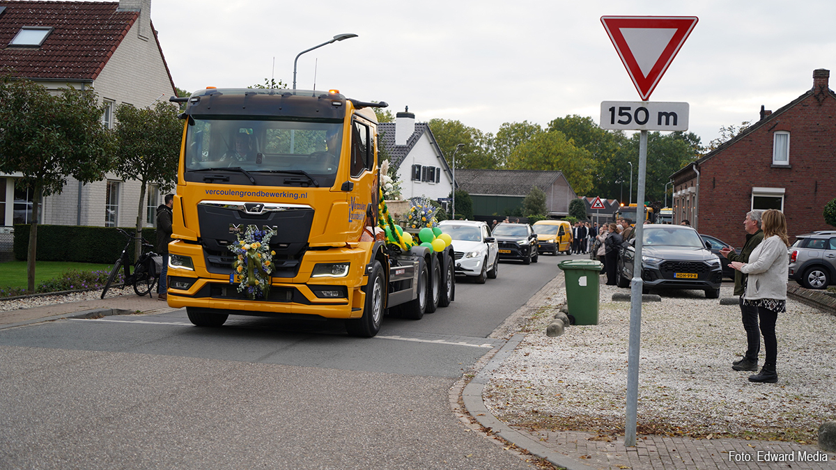 Vrachtwagens en tractoren sloten bij de rouwstoet aan. Langs de route stonden tientallen buurtbewoners, vrienden en bekenden om hun steun te betuigen.