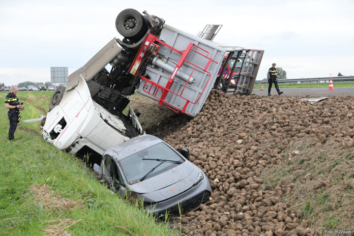 FIJNAART – Op de A59 bij Fijnaart is vrijdag een vrachtwagen samen met een personenauto van de weg geraakt. De vrachtwagen verloor daarbij zijn lading suikerbieten, die verspreid raakten over de snelweg en in de sloot.