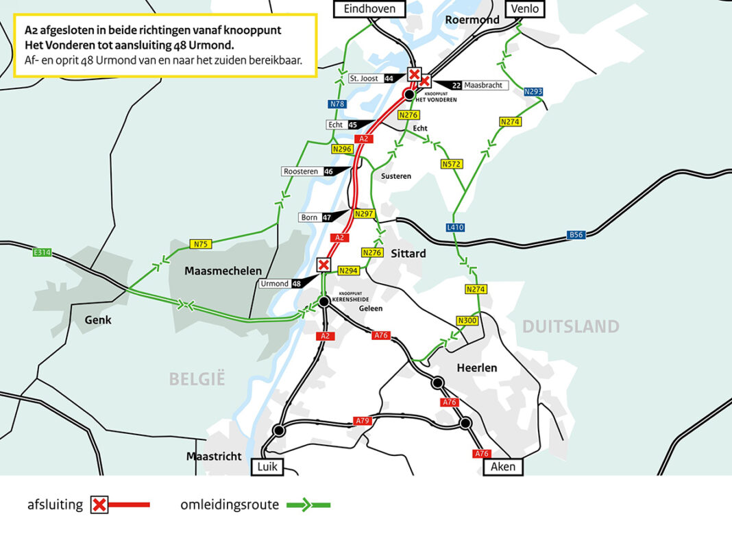 - Verkeer richting Roermond/Venlo/Nijmegen rijdt via de A76/N300/N274 of via Duitsland.