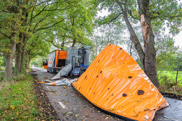 De vrachtwagenchauffeur moest uitwijken, raakte een boom en belandde in de berm. Hierdoor brak de afdekking van de trailer af en kwam op de weg terecht.