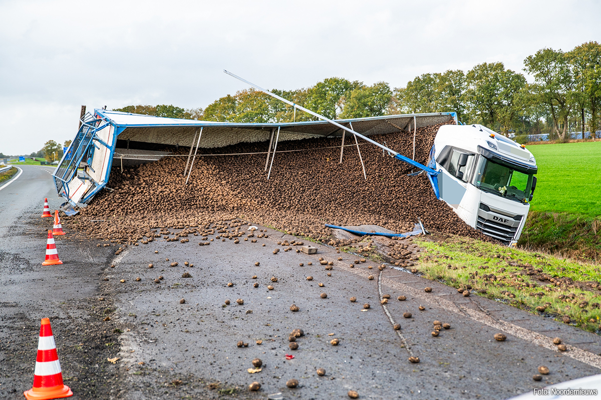 De vrachtwagen, afkomstig uit Smilde, had daar eerder de lading aardappelen geladen. Op weg richting Oosterwolde ging het mis. De chauffeur is door het ambulancepersoneel gecontroleerd, maar kwam met de schrik vrij.