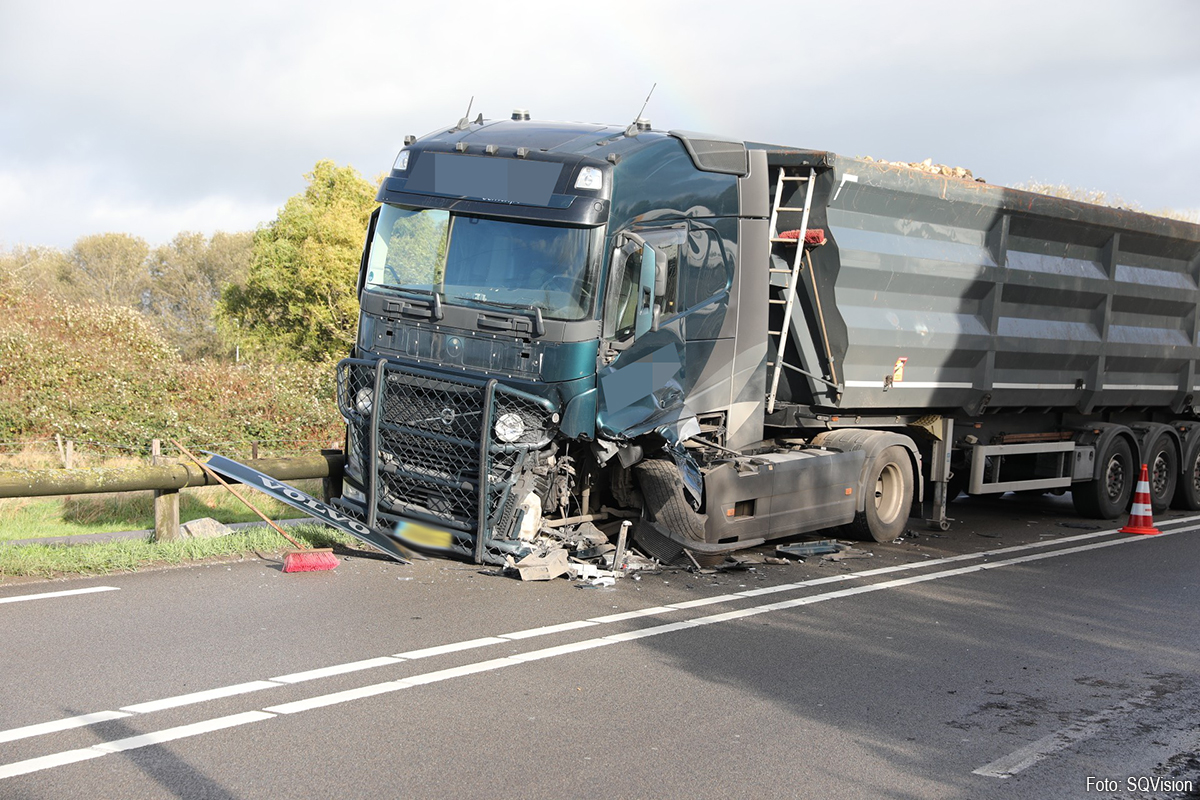 De vrachtwagen trekker raakte zwaar beschadigd. De chauffeur kwam met de schrik vrij.