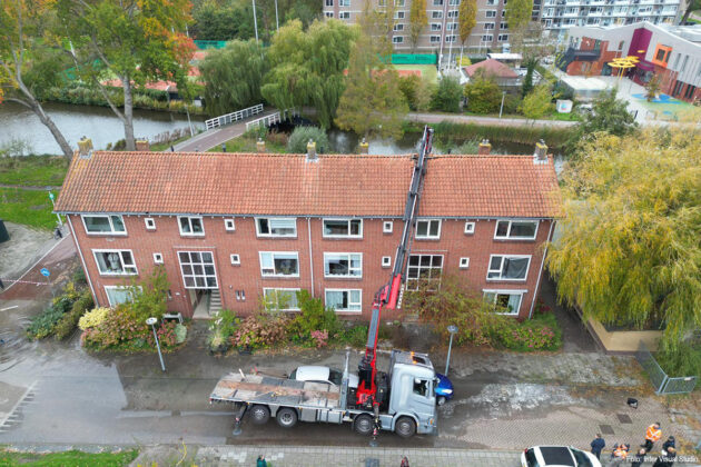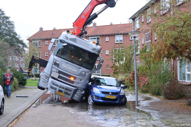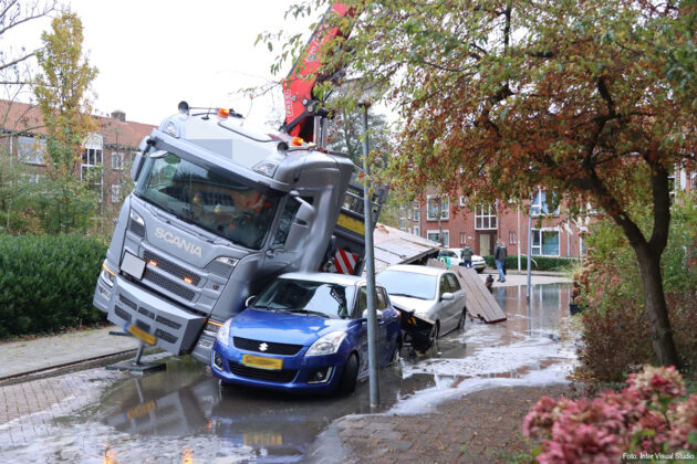 KROMMENIE – Aan de Landzichtlaan in Krommenie is woensdagmiddag een vrachtwagen met kraan gekanteld en op een woning terechtgekomen. Daarbij is schade ontstaan aan het dak van het huis.