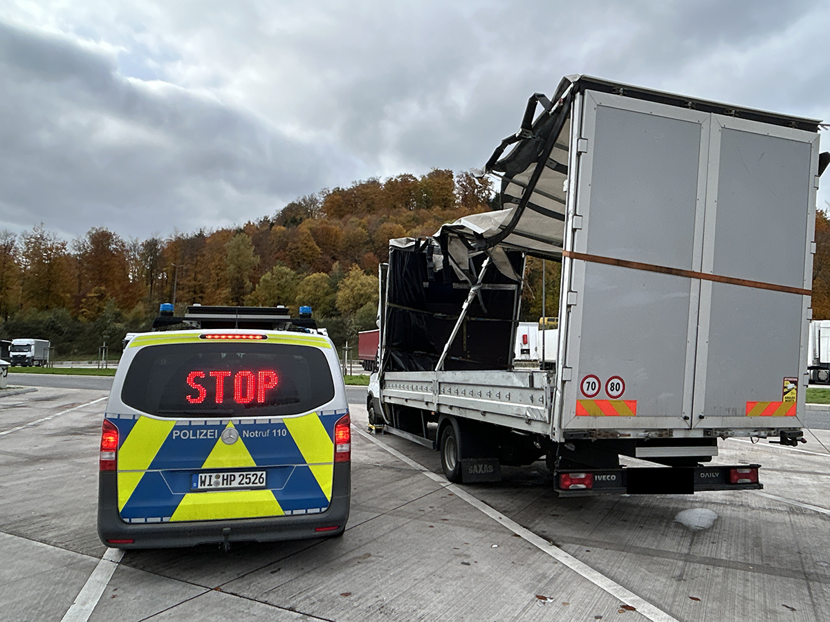 BREITENBACH AM HERZBERG – De Duitse politie heeft woensdag 28 oktober op parkeerplaats Rimberg langs de A5 een zwaar beschadigde “Polensprinter” aan de kant gezet. Het voertuig bleek betrokken te zijn geweest bij een verkeersongeval in Frankrijk en was op weg terug naar Polen. Volgens de politie verkeerde de combinatie in een zodanig slechte staat dat verder rijden niet was toegestaan.