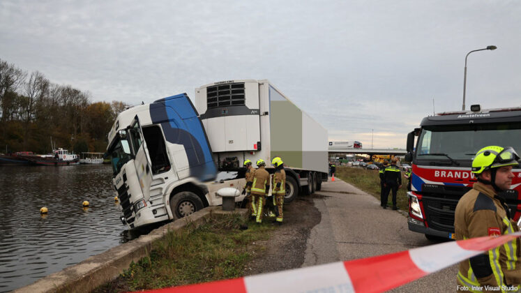 De vrachtwagen reed het gras op en kwam met de cabine boven het water tot stilstand. De hulpdiensten werden opgeroepen, waaronder een duikteam.