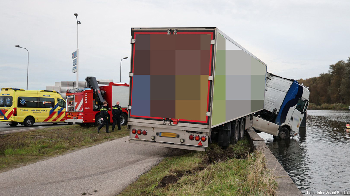 De vrachtwagen reed het gras op en kwam met de cabine boven het water tot stilstand. De hulpdiensten werden opgeroepen, waaronder een duikteam.