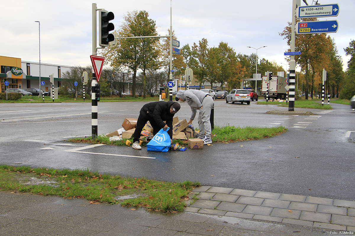 De rolcontainers kwamen op de weg terecht en zorgden voor enige chaos. Mensen in de omgeving hielpen met het oprapen van de verpakte diepvriesartikelen van de straat.