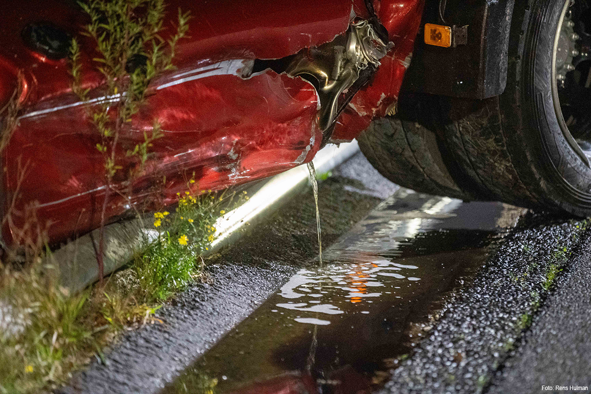 Door de klap is de dieseltank gescheurd, waardoor honderden liters diesel in de berm en de afvoergoot terecht zijn gekomen.