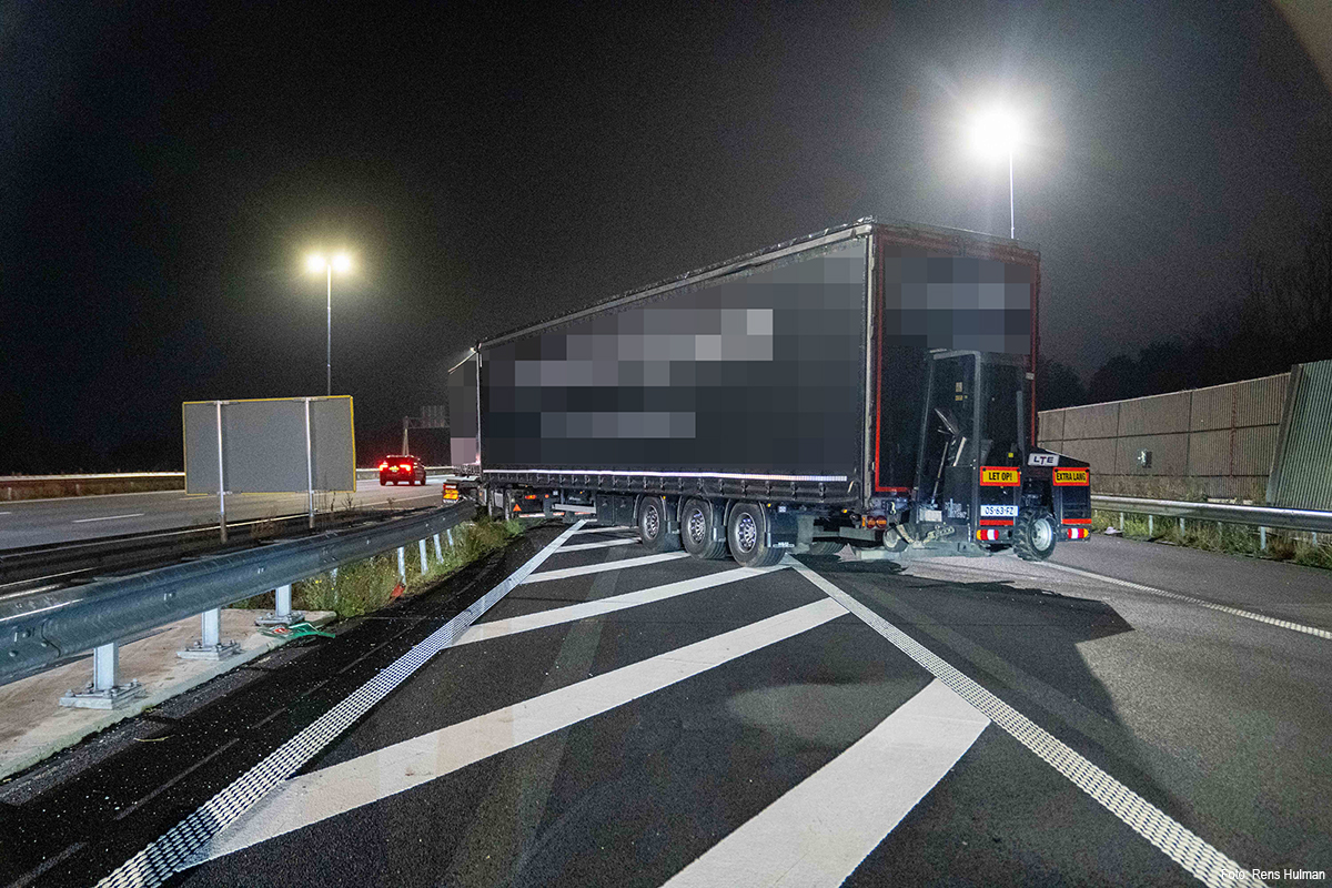De extra lange vrachtwagencombinatie staat schuin over de parallelweg en blokkeert daar de volledige rijbaan. Ook op de hoofdrijbaan is de rechterrijstrook afgesloten.