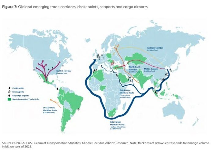 Het rapport van Allianz Trade stelt dat ‘traditionele’ vaarwegen en havens (waaronder Rotterdam en Antwerpen) bovengemiddeld kwetsbaar zijn, bijvoorbeeld voor geopolitieke spanningen of klimaatrisico’s.