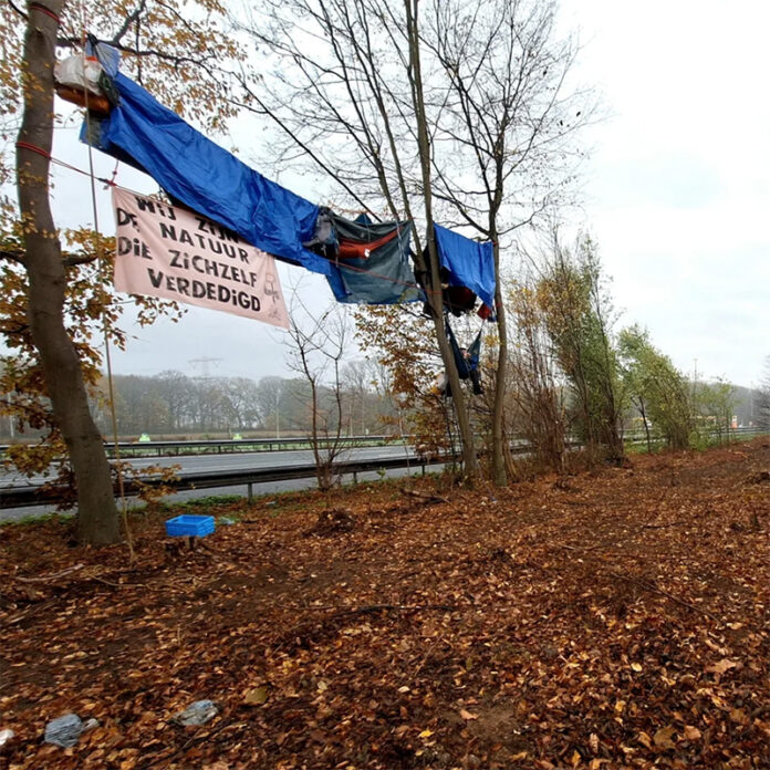 De demonstranten van de actiegroep ‘Stop A2 verbreding’ willen niet dat de bomen worden gekapt voor de verbreding van de weg. Ook zijn ze tegen het gebruik van opvulmateriaal Beaumix, een restproduct van afvalverbranding, laten ze op hun Instagram-pagina weten. Rijkswaterstaat heeft de bomen om de actievoerders heen al gekapt.