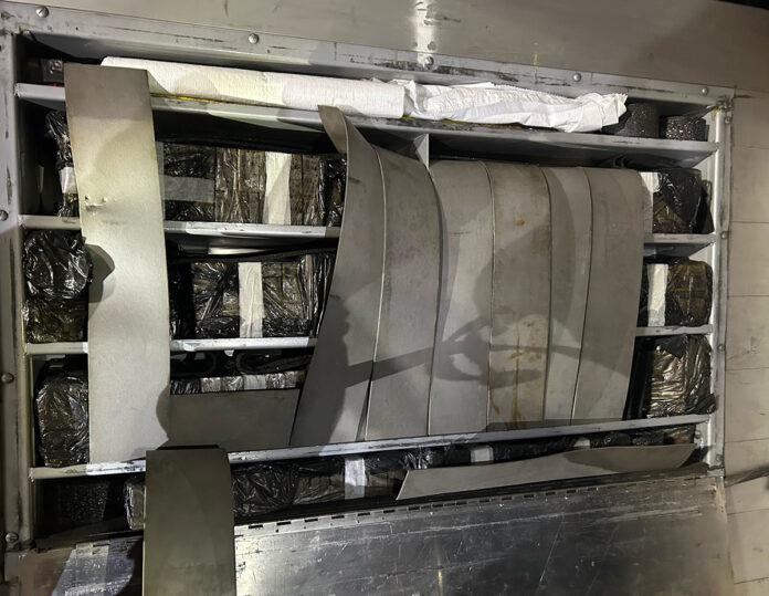 Op de röntgenbeelden waren duidelijke afwijkingen zichtbaar in de constructie van de trailer. Bij nader onderzoek vonden douanebeambten aan de voorzijde van de oplegger een professioneel ingericht verborgen compartiment waarin de smokkelwaar was verstopt.