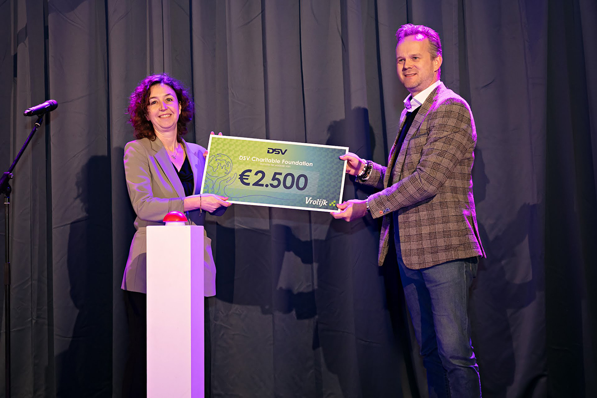Als opleveringsgeschenk overhandigde Vrolijk-directeur Geus een cheque van 2.500 euro aan de DSV Charitable Foundation.