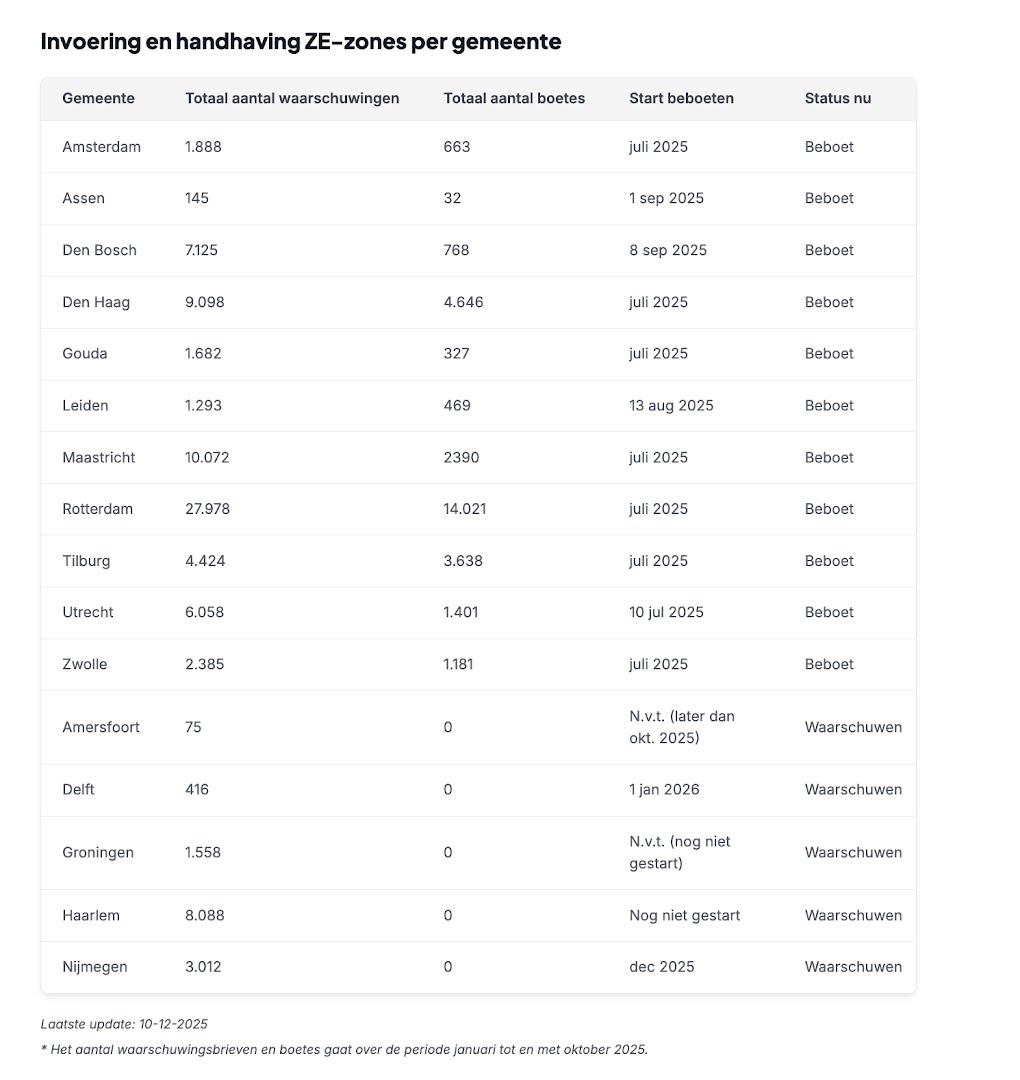 In september 2025 werden in één maand tijd 8.895 boetes uitgedeeld, het hoogste aantal sinds de invoering van ZE-zones. Gemeenten stapten vanaf juli over van waarschuwen naar beboeten. De boetes bedragen € 120,- voor bestelauto’s en € 310,- voor vrachtauto’s.