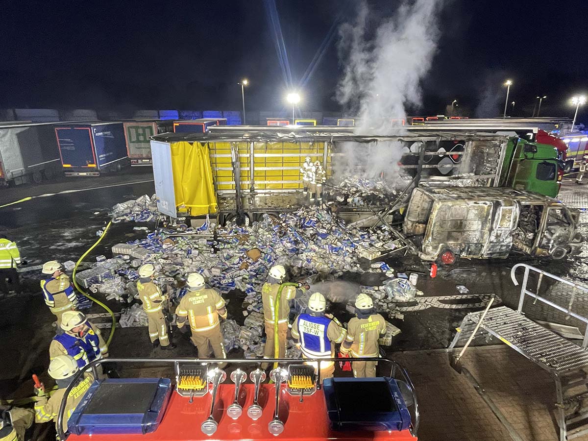 De bestelbus en de aangrenzende vrachtwagencombinatie raakten grotendeels verwoest of liepen zware brandschade op. De tweede vrachtwagen bleef dankzij het snelle ingrijpen van de brandweer gespaard.