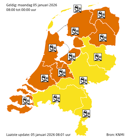 In de ochtend vallen de sneeuwbuien vooral in het westen, midden en noorden, waar in korte tijd 2 tot 5 centimeter sneeuw kan vallen en lokaal zelfs 5 tot 8 centimeter. In de middag kunnen ook in andere delen van het land (sneeuw)buien voorkomen. Tijdens deze buien kan opnieuw 1 tot 3 centimeter sneeuw vallen, plaatselijk mogelijk 3 tot 5 centimeter.