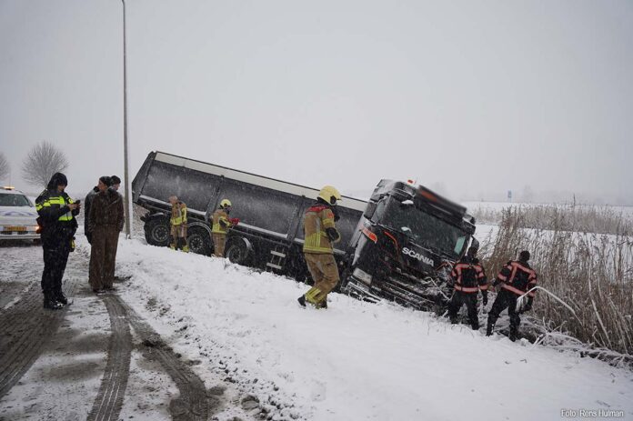 De vrachtwagen zal door een bergingsbedrijf uit het talud moeten worden gehaald. Vanwege de drukte op de weg en de gladheid kan deze berging mogelijk op een later moment plaatsvinden.