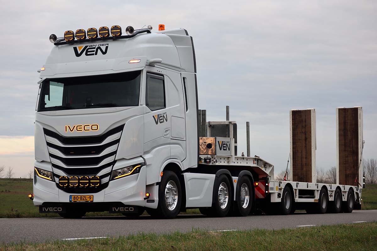 De trekker werd voor indienststelling gespoten in de witte bedrijfskleur van Van der Ven en verder aangepast aan de wensen van de chauffeur. Zo is de lichtbak vervangen door vijf verstralers en is het voertuig voorzien van extra verlichting en luchthoorns. “Nu is hij helemaal af,” besluit Westerlaken. “Ik ben echt dik tevreden over deze nieuwe IVECO S-Way.”