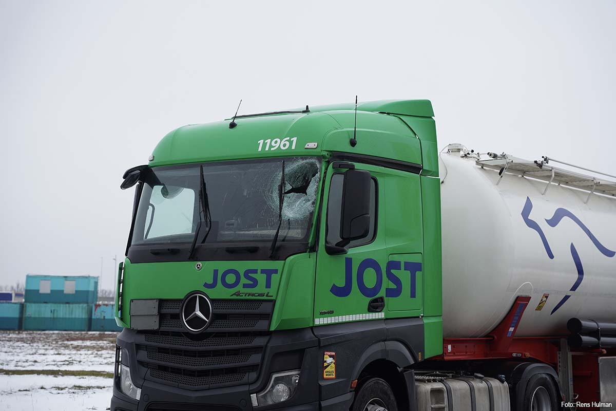 Door de impact sloeg de voorruit volledig kapot en kwamen ijs en glasscherven in de cabine terecht. De chauffeur raakte daarbij gewond, maar wist zijn voertuig nog zelfstandig en gecontroleerd van de weg te rijden. Hij zette de vrachtwagen veilig neer op een nabijgelegen industrieterrein.