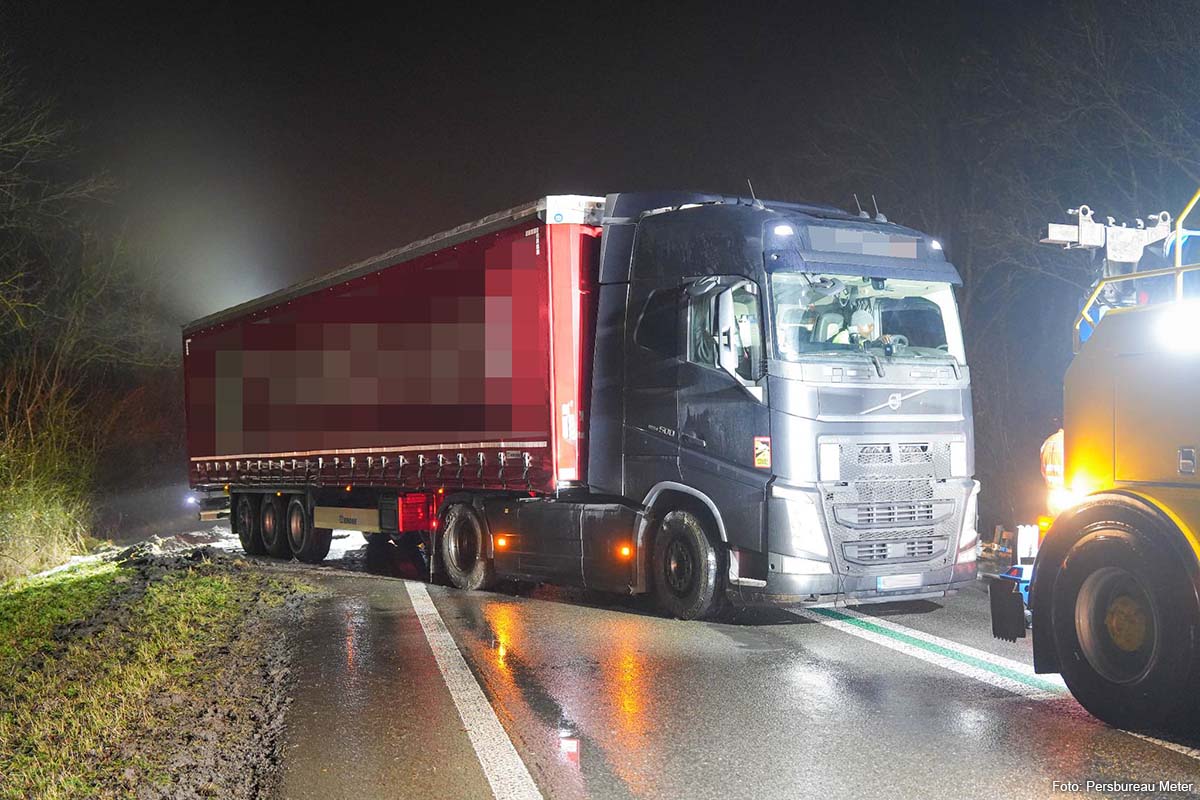 Rijkswaterstaat en een bergingsbedrijf zijn ter plaatse. De berger is bezig met het lostrekken van de vrachtwagen. De chauffeur raakte bij het incident niet gewond.