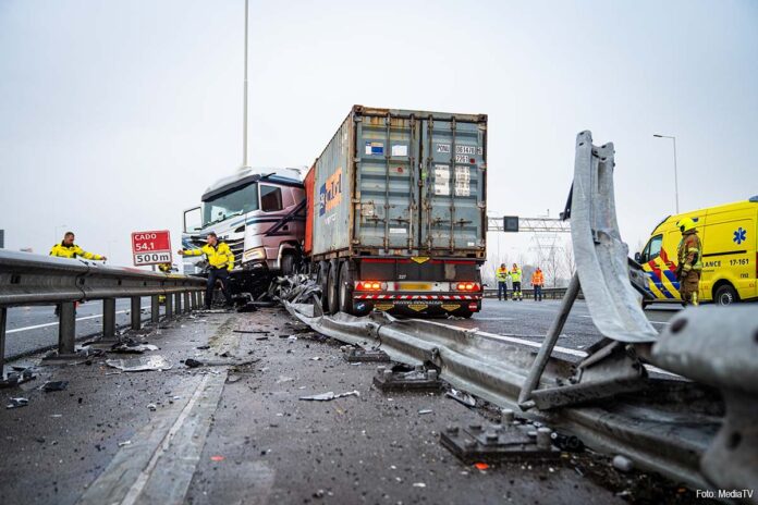 De vrachtwagen is op de hoofdrijbaan geschaard en staat aan de linkerkant tegen de vangrail. Daarbij is een groot deel van de vangrail beschadigd geraakt. Ook is de dieseltank van de vrachtwagen vernield, waardoor een grote plas diesel op het wegdek ligt.