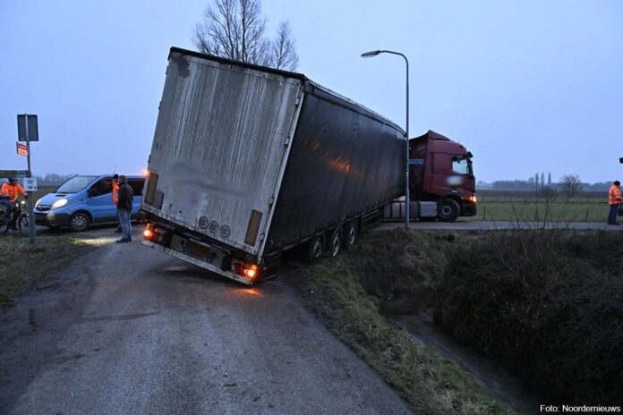 ROODESCHOOL – Een vrachtwagenchauffeur heeft maandag problemen gekregen op de kruising van de Laanweg en de Greedeweg bij Roodeschool. De chauffeur schatte een bocht verkeerd in, waardoor de trailer deels van de weg raakte en aan de rand van een sloot terechtkwam.