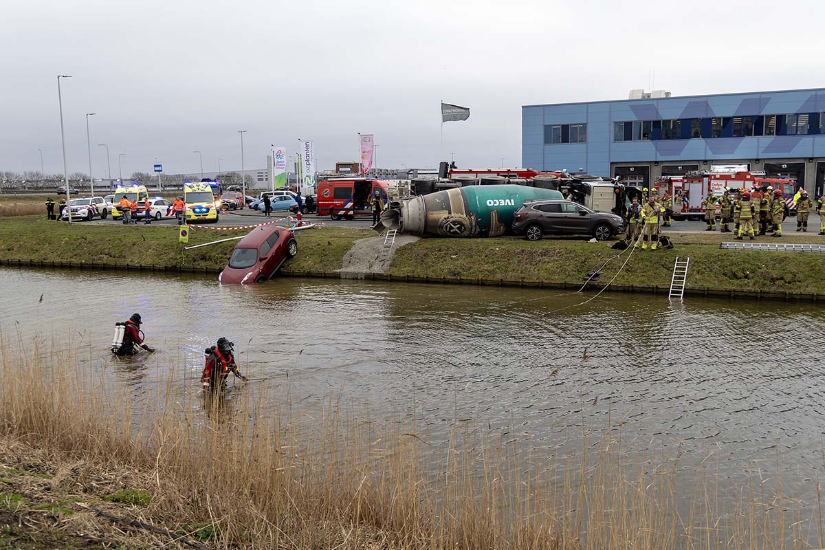 Gekantelde cementwagen duwt auto in het water in Aalsmeer