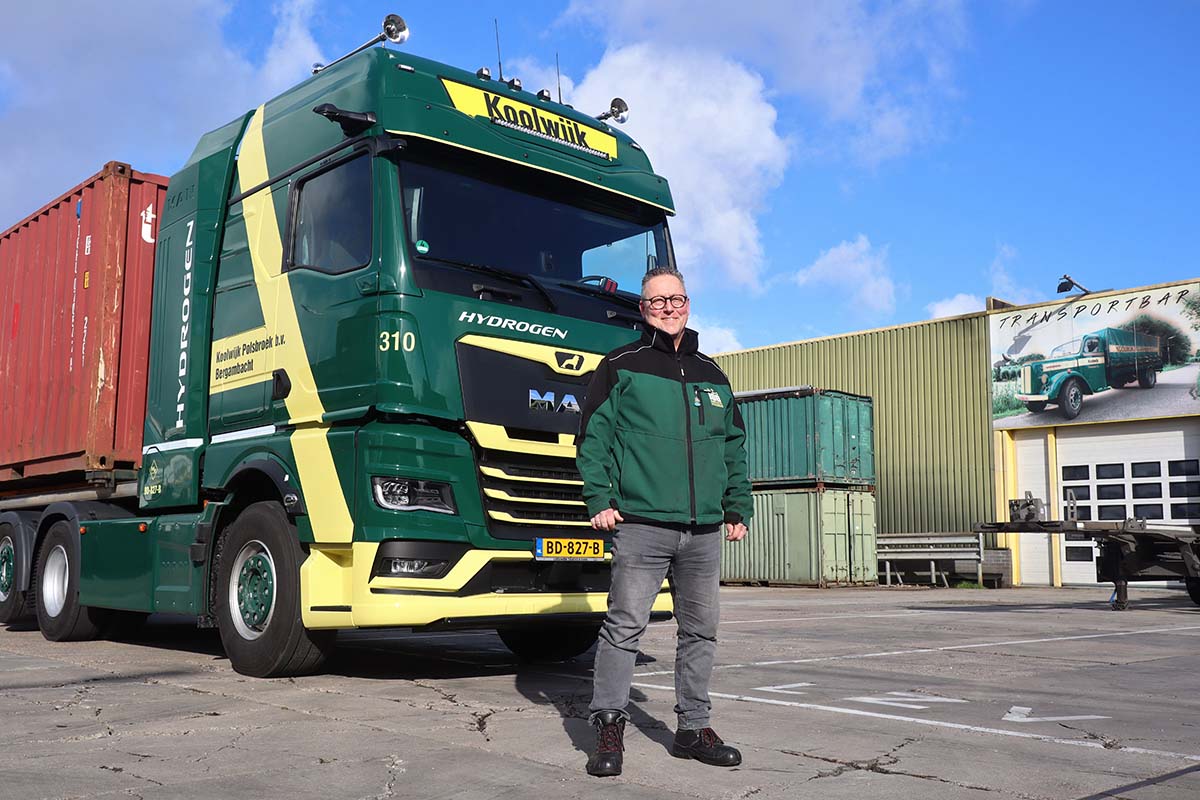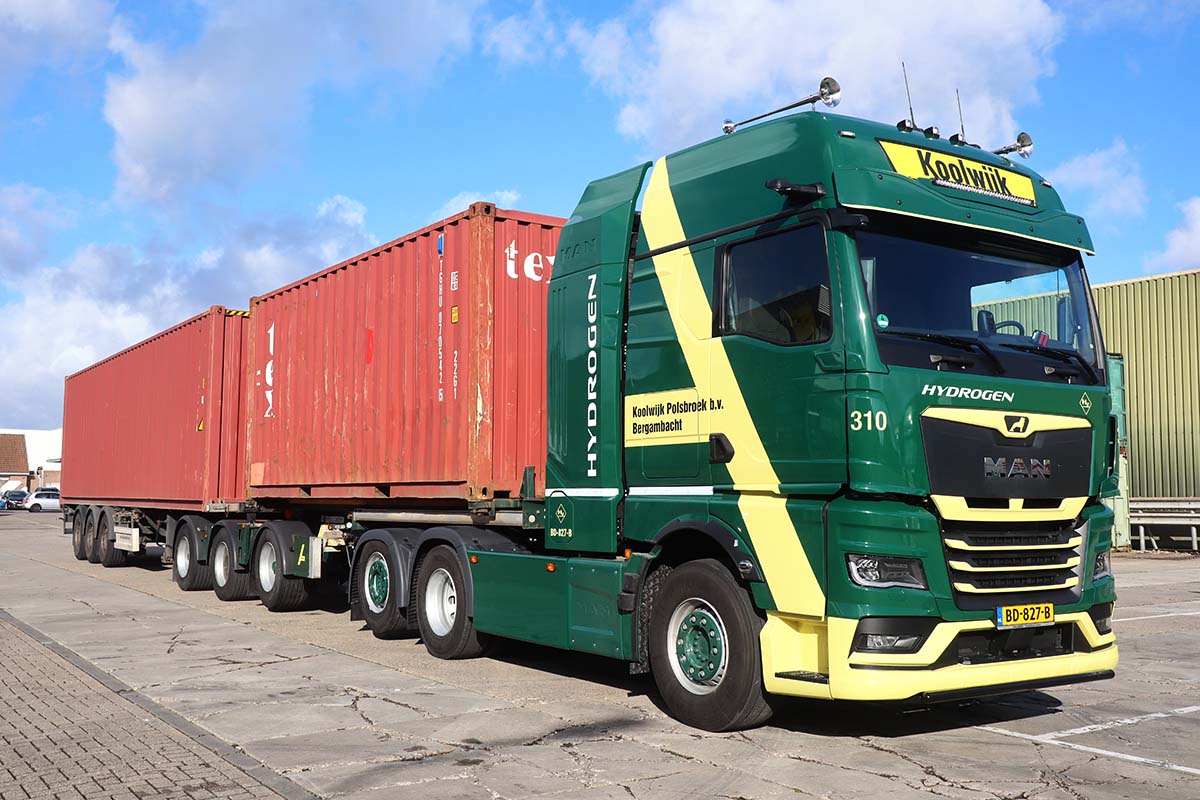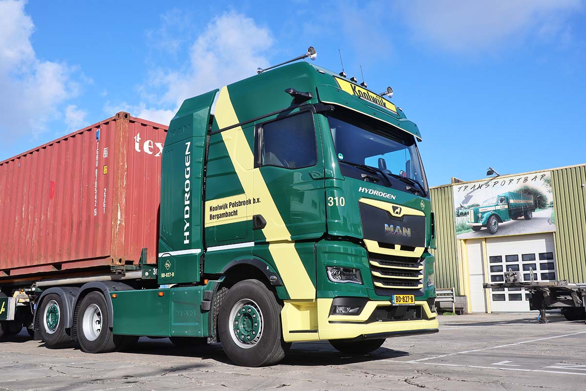 BERGAMBACHT – Koolwijk Logistics heeft een MAN hTGX-trekker met een zero-emission waterstof-verbrandingsmotor in gebruik genomen. De 6×2-trekker wordt ingezet als LZV-combinatie voor containertransport en vormt volgens het bedrijf een belangrijke stap in de verdere verduurzaming van het wagenpark.