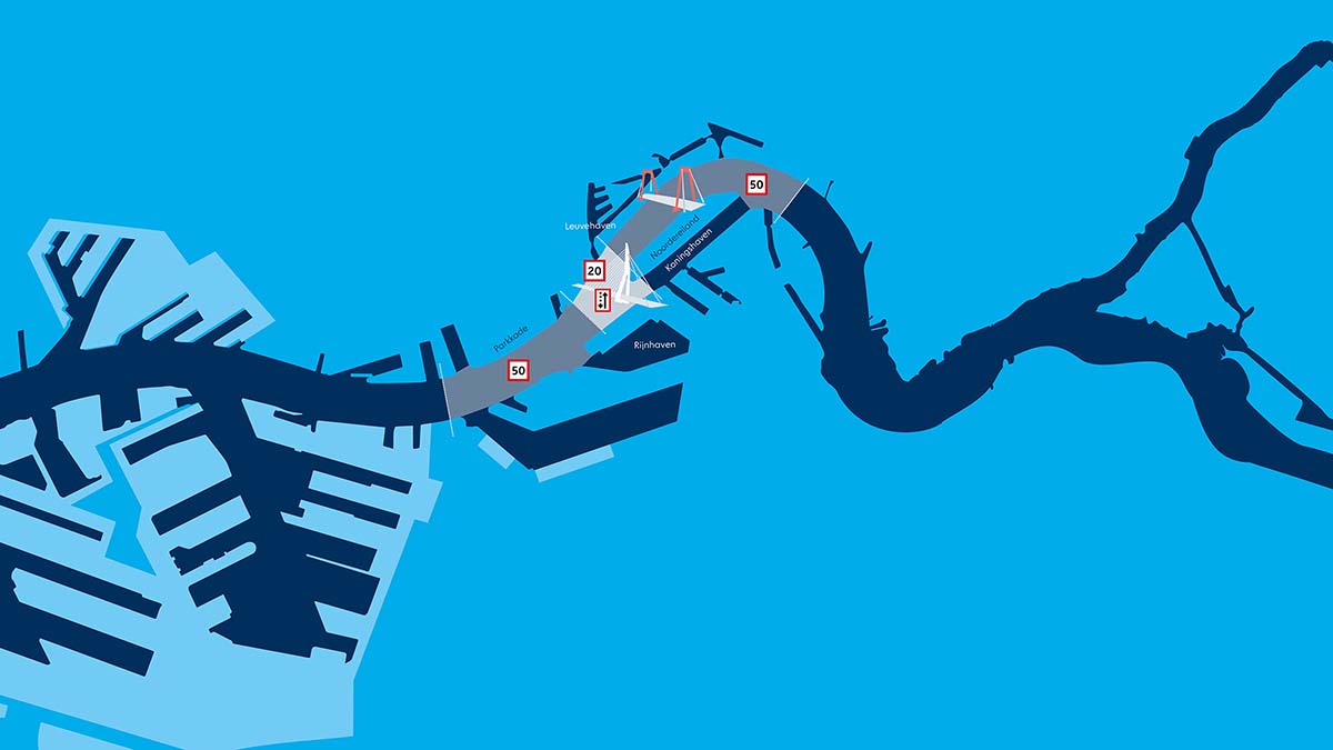 In de zogenoemde Erasmusbrugzone, die loopt van de Waterbussteiger aan de Willemskade tot de radartoren aan de Boompjes, geldt voortaan een maximumsnelheid van 20 kilometer per uur. In de aanloopgebieden, van de Sint Jobshaven tot de Nassauhaven, mogen schepen maximaal 50 kilometer per uur varen. Langs de vaarweg worden borden geplaatst om de zones duidelijk aan te geven.