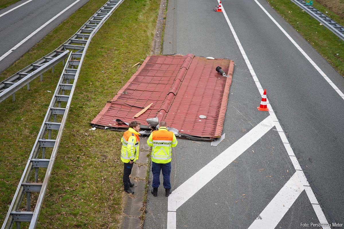 NOORDBROEK – Op de N33 tussen knooppunt Zuidbroek en Noordbroek heeft een vrachtwagen het dak van een chalet verloren bij een viaduct. Dat gebeurde doordat de combinatie te hoog bleek voor de doorgang.